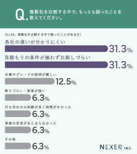 「各社の違いが分かりにくい」と「見積もりの条件が揃わず比較しづらい」が、ともに31.3%で同率1位という結果でした。